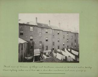 | Keywords: archives state records nsw staterecordsnsw newsouthwales blackandwhite terrace houses terracehouses buildings residence backyard text black and white Back view of terrace of shops and residences situated at 3, 5 ,7, 9 and 11 Bridge Street, Sydney Dated: 4 October 1889 Digital ID: 745_a019_a019000004 Rights: www.records.nsw.gov.au/about-us/rights-and-permissions In 1879 The City of Sydney Improvement Act was constituted as a result of the findings of the Sydney City and Suburban Sewage and Health Board regarding the poor condition of buildings and sanitation within the City of Sydney due to a lack of proper legislation and codes of building practice. The City of Sydney Improvement Board was appointed to execute the Act. These photographs, taken by private photographers for the Board, show buildings in need of repair or undergoing alterations, as well as views of streets showing the condition of awnings, signboards and walls of shops, hotels and private residences. We'd love to hear from you if you use our photos. Many other photos in our collection are available to view and browse on our website using Photo Investigator. Back view of terrace of shops and residences situated at 3, 5 ,7, 9 and 11 Bridge Street, Sydney Dated: 4 October 1889 Digital ID: 745_a019_a019000004 Rights: www.records.nsw.gov.au/about-us/rights-and-permissions In 1879 The City of Sydney Improvement Act was constituted as a result of the findings of the Sydney City and Suburban Sewage and Health Board regarding the poor condition of buildings and sanitation within the City of Sydney due to a lack of proper legislation and codes of building practice. The City of Sydney Improvement Board was appointed to execute the Act. These photographs, taken by private photographers for the Board, show buildings in need of repair or undergoing alterations, as well as views of streets showing the condition of awnings, signboards and walls of shops, hotels and private residences. We'd love to hear from you if you use our photos. Many other photos in our collection are available to view and browse on our website using Photo Investigator. |