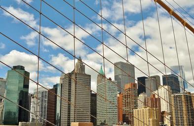 Keywords: bridge sun manhattan brooklyn new york architecture downtown view skyscraper york city building skyline sky blue clouds town tourism construction