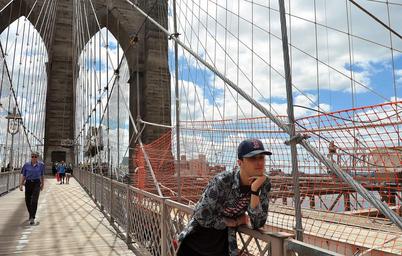 Keywords: bridge sun manhattan brooklyn new york architecture downtown view skyscraper york city building skyline river water sky blue clouds town tourism construction boy man