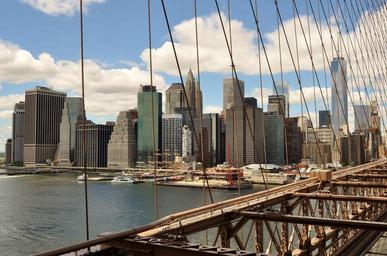 Keywords: bridge sun manhattan brooklyn new york architecture downtown view skyscraper york city building skyline river water sky blue clouds town tourism construction