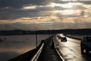 Keywords: bridge sunrise water boat car traffic street rain