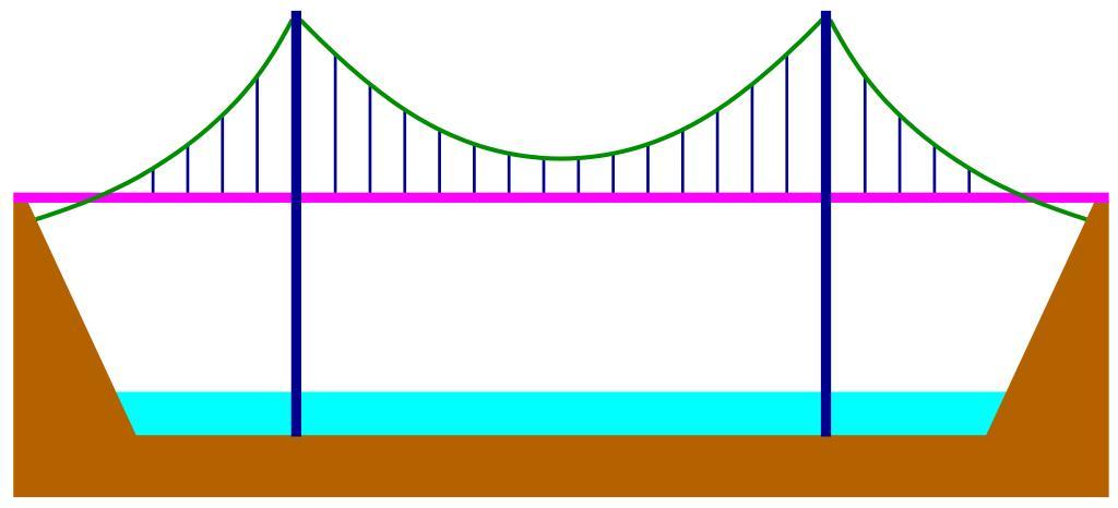 | Keywords: Bridge-suspension-nonsimple.svg en A suspension bridge This drawing is used for comparing this kind of bridge with File Bridge-suspension-simple svg where the two lines in magenta and green cable and pathway are merged in one own Tizio 2009-03-25 Suspension bridge drawings |