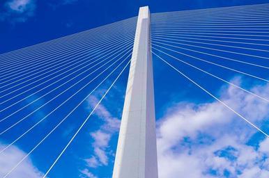 Keywords: bridge suspension wires architecture landmark sky clouds structure transportation travel cables suspended blue