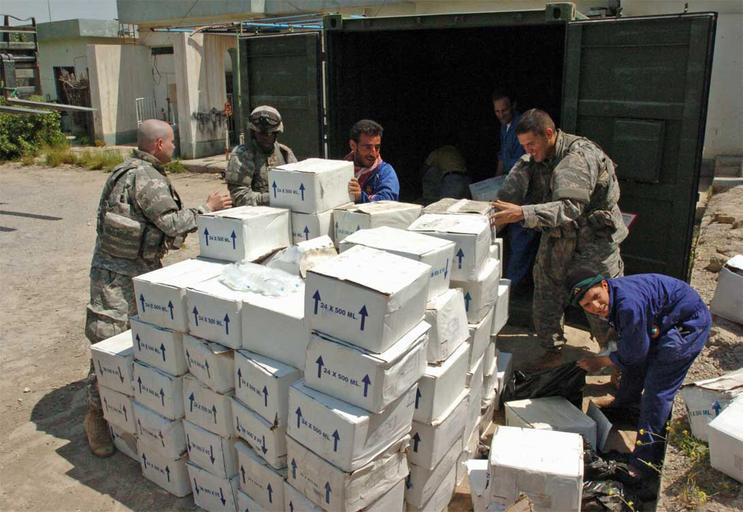 | Keywords: Brigade Provides Hospital Supplies to Treat Iraqi Children DVIDS42676.jpg en 25th Infantry Division Soldiers from Schofield Barracks HI work with local Iraqis to unload a large delivery of vital medical supplies for the Kirkuk Pediatric Hospital in Kirkuk Iraq on April 19 2007 The delivery consisted of IV fluids sutures antibiotics x-ray films and more The Kirkuk Pediatric Hospital is the only pediatric hospital in the province and has been undersupplied for over a year due to security issues with transporting medical supplies from the Ministry of Health in Baghdad 2007-04-27 https //www dvidshub net/image/42676 42676 2007-04-27 16 24 KIRKUK IQ PD-USGov Schofield Barracks 25th Infantry Division United States Images from DoD uploaded by Fæ |