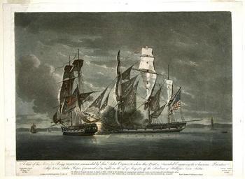 | Keywords: BriggObserveregagingtheJack29May1782HalifaxPublRDodd1Sept1784BerleyRobisonCollectionUSNavalAcademy.jpg en A View of His Majesty ™s Brigg Observer Commanded by Lieut John Crymes to whom this print is inscribed Engaging the American Privateer Ship Jack John Ropes commander by Night on the 29th of May 1782 Off the Harbour of Hallifax Nova Scotia Aquatint by Robert Dodd 1784 Beverley Robison Collection US Naval Academy publisher R> Dodd 1784 PD-old-100 Naval battles of the American Revolutionary War |