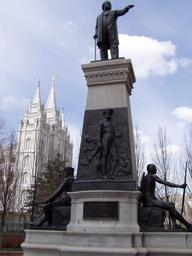 | Keywords: Brigham Young Monument.jpg Brigham Young Monument or Pioneer Monument a bronzed historical monument located on the north sidewalk of the intersection at Main and South Temple Streets of Salt Lake City Utah It was originally erected in the center of the intersection of Main and South Temple streets in 1897 where it stood until 1993 when it was moved a few yards north to its present location near the Joseph Smith Memorial Building Artist Cyrus Edwin Dallin <br>Photo Dundak Artwork 1897<br>Photo 13 49 15 March 2005 Artist Cyrus Edwin Dallin November 22 1861 “ November 14 1944 <br>Photo Dundak Statue PD-old-auto-1923 1944 Photo GFDL Cc-by-sa-3 0-migrated Brigham Young Monument Salt Lake Temple Taken with Olympus C-720UZ |