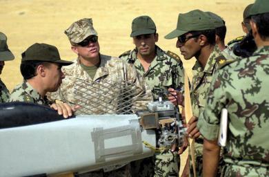 | Keywords: Bright Star 2005 DVIDS10358.jpg en WESTERN EGYPTIAN DESERT Sept 20 2005 - Marine Chief Warrant Officer 4 Thomas E Morris second from left ground-based air defense lead Marine Corps Systems Command gives a group of Egyptian Army officers a briefing on the MiG-23 Bandit the unmanned aerial vehicle used during the Marine Air Control Group 38 Detachment 13th Marine Expeditionary Unit's Stinger missile shoot in the Western Egyptian Desert The Cynthiana Ky native participated to Exercise Bright Star specifically to provide technical support for the lightweight fiberglass target drones used in the training The evolution allowed coalition forces from the host nation and the Netherlands to observe the equipment and procedures used by U S Marines to engage low-flying aircraft and met its goal of strengthening the bond between coalition forces as well as displaying a portion of the 13th Marine Expeditionary Unit Special Operations Capable 's warfighting capability 2005-09-27 https //www dvidshub net/image/10358 10358 2005-09-27 14 00 PD-USGov 13th Marine Expeditionary Unit Images from DoD uploaded by Fæ |