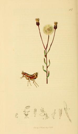Keywords: British Entomology Volume 7 (John Curtis) Plate 417.jpg en John Curtis British Entomology 1824-1840 Folio 417 Ceratophyllus elongatus synonym of Ischnopsyllus elongatus the Yellow Bat ™s Flea The plant is Erigeron acer Blue Fleabane CURTIS PLATE NOTE Entomological Magazine 1 1833 Art XLI ”On the Structure of the Antennae in the Order Aphaniptera of Kirby with reference to the Propriety of the Establishment of Genera upon the Variations of those Organs By J O Westwood Esq F L S c In the 417th plate of Mr Curtis's British Entomology for August 1832 another species of flea was illustrated under the name of Ceratopyllus elongatus with the observations that from repeated examinations that gentleman had found it necessary to divide the Pulices into two genera; that the P Talpae previously figured as an example of the genus Pulex belonged in fact to the new genus ; and that the discovery of the antennae of P canis by Mr Haliday rendered it necessary to erase the paragraph in the 114th folio quoted above A copy of Mr Haliday's figure of the antennae of the latter species which is considered as a true Pulex is introduced into Mr Curtis's plate of Ceratopyllus ; but it is not quite correct being described as only two-jointed the basal joint having only a single bristle near its internal apex The dissections of Ceratophyllus are taken from the Pulex hirundinis which is considered as the type and of which the antennae are described as slightly attenuated and four-jointed although one of them is represented in the plate as five-jointed Of the species figured as the example of the genus Cer elongatus the antennae are not described; but in fig 16 they are represented as eight-jointed the basal joint being pear-shaped the second subcyathiform and the remainder transverse forming a thick oval mass In the coloured figure of this insect these organs are however represented of the same attenuated form as in Cer hirundinis and apparently having only six joints And in the Pulex talpa which is expressly stated to belong to Ceratophyllus the antenna are described and figured as ten-jointed the basal joint being ovate-truncate and the nine remaining annulose and forming a rather elongate-ovate mass http //www biodiversitylibrary org creator John Curtis entomologist 1836 British Entomology Plate 417 cutted png British Entomology Volume 7 John Curtis Ischnopsyllus elongatus Fleas in art Erigeron acer PD-old-100