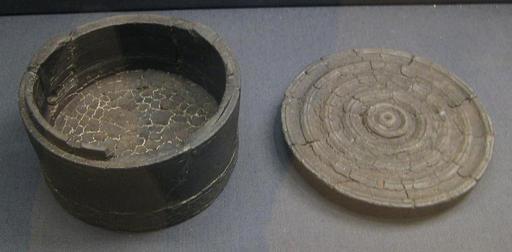 | Keywords: British Museum Thetford Hoard shale pot.jpg en Shale pot from the Thetford Hoard own BabelStone 2010-08-21 Details Turned circular shale box with a raised lid-seating from the Thetford Hoard Height 53 mm box <br/>Height 14 mm lid <br/>Diameter 100 mm box <br/>Diameter 105 mm lid G49/dc23 cc-zero Thetford Hoard Pot lids |