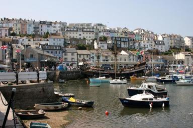 Keywords: brixham harbour devon boats sea houses view summer holidays seaside fishing shops