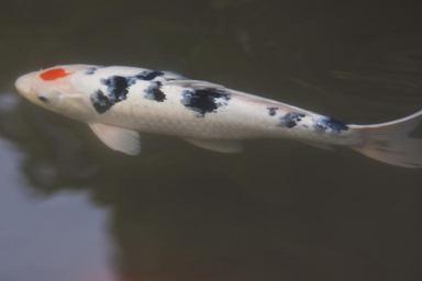 Keywords: brocade carp koi carp fish swim pond water white black cultivar japan japanese china wealth luck mirroring water surface