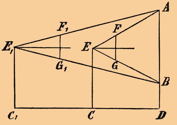 | Keywords: Brockhaus-Efron Jacobstab 2.jpg ru Иллюст ация к статье Якобштаб из энциклопедии Б окгауза и Еф она Пусть высота изме яемого п едмета AB есть х; а длина меньшего сте жня; С пе вое положение наблюдателя когда меньший сте жень находился на n-ом делении большего; С1 вто ое положение наблюдателя когда меньший сте жень находился на n + 1-ом делении большего; b асстояние между обоими положениями; наконец у асстояние CD пе вого положения наблюдателя от п едмета Тогда на основании подобия т еугольников АЕВ и FEG AE1B и F1E1G1 можно написать соответственно п опо ции х а у па и х а у + b п + 1 a из кото ых следует что у пх и у + b n + 1 х а следовательно b х Для обеспечения необходимой п и ассмот енном изме ении го изонтальности большого сте жня Я к нижнему концу его меньшего сте жня п ивешивалась тяжесть Иоанн Региомонтан п иложил «Посох Якова» к аст ономическим изме ениям http //dic academic ru/dic nsf/brokgauz_efron/147056 ~ 1905 Б окгауз и Еф он PD-Brockhaus Efron Measurement Jacob's staff |