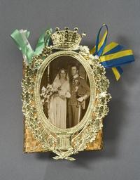 | Keywords: Bröllopskonfekt - Livrustkammaren - 7972.tif Sibylla hertiginna av Västerbotten Gustaf Adolf Hertig av Västerbotten prins 1906- Stockholms slott Sverige plain text Rektangulär konfekt troligen av vit hård sockerskiva dekor av flätat rutverk På framsidan ovalt fotografi med prinsparets bröllopsporträtt omgivet av förgylld pappram med eklövskrans Ramen krönt av prinskrona Under fotografiet är fäst två sidenbandsrosetter en i vitt/grönt den andra i blå/gult original caption Bröllopskonfekt LRK 20335<br/> Nyckelord Godis Ask Bröllop Sibylla Gustaf VI Adolf Föremålsbild 1932 paper Färg guld material papper - silk Färg gul/blå grön/vit material siden size mm 65 50 LRK Gustav Vasa tur och retur place of origin original filename lm_dig6040 56903 inventory number LRK 20335 7972 CC-BY-SA Göran Schmidt Göran Schmidt Wedding of Gustaf Adolf Hereditary Prince of Sweden and Princess Sibylla of Saxe-Coburg and Gotha Media contributed by LSH unmatched material Media contributed by LSH unmatched objKeyword Media contributed by LSH unmatched keyword Media contributed by LSH 2013-10 |