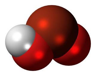 | Keywords: Bromous acid molecule spacefill.png Space-filling model of the bromous acid molecule an oxoacid of bromine in an oxidation state of +3 Color code F0F0F0 Hydrogen H white<br> F51E1E Oxygen O red<br> B42814 Bromine Br red-brown<br> 2011-11-21 own DS Visualizer Jynto talk Ball-and-stick version cc-zero Images by Jynto Bromous acid |