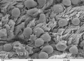 | Keywords: Bronchiolar epithelium 2 - SEM.jpg Scanning electron microscope image of lung epithelium which consists of ciliated and non-ciliated bronchiolar cells There are red blood cells on the surface of the epithelium Zeiss DSM 962 SEM http //remf dartmouth edu/imagesindex html http //remf dartmouth edu/images/mammalianLungSEM/source/1 html Louisa Howard Charles Daghlian PD Louisa Howard and Charles Daghlian Cell biology Epithelium Scanning electron microscopic images | ||||