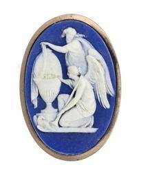 | Keywords: Bröstnål av Wedgewood-gods med änglar, 1700-tal - Hallwylska museet - 110396.tif LSH artwork Fabriken Etruria sv BRÖSTNÅL Plakett av wedg-wood-gods samt guld Stående oval Plaketten av ljusblå s k jasper-ware På framsidan i vit relief en äggformig gravurna på kort hals och fyrsidig fot Skivan fattad i slät ram av guld På baksidan två tvärdående skenor på den ena fäst en nål på scharner på den andra kryll Stämpel på skivans baksida Engelskt arbete från 1700-talets slut fabriken Etruria Staffordshire Inköpt av Wilhelmina von Hallwyl från antikvitetshandlare Ed Kahlert Tyskland december 1894 original caption Bröstnål av Wedgewood-gods med änglar 1700-tal <br/> Nyckelord Urna Ängel Wedgewood Föremålsbild Bröstnål Brosch end other date century 18 gold g 6 4 size cm 3 8 2 7 HWY place of origin England original filename hm_dig24446 21142 inventory number HWY XXXVI B d 01 110396 CC-BY-SA Helena Bonnevier Angels Urns Brooches Fibulae Jewellery in the Hallwyl museum Helena Bonnevier Media contributed by LSH unmatched material Media contributed by LSH unmatched creator Media contributed by LSH unmatched keyword Media contributed by LSH 2016-12 18th-century jewellery |