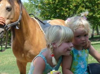 Keywords: brothers and sisters horse children friends blond braids dimple hug green animal girl play human summer