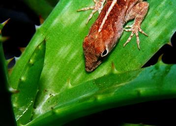 Keywords: brown anole anolis sagrei lizard aloe plant brown anole green reptile animal wildlife relaxed resting creature dragon nature lehigh acres florida