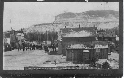 | Keywords: businesses mount mckay mountmckay brown street brownstreet woodbine hotel woodbinehotel hotels kam river kamriver railway drug store drugstore thunder bay thunderbay ontario canada history blackandwhite outdoor monochrome photo border black and white Date: 1885 Description: Fort William’s first "main street" no longer exists. In the 1870s and ’80s, Brown Street extended south all the way to the bank of the Kam River where a dock provided ships with access to the community’s business core. The newly-installed railway tracks separated the shops from the houses springing up along the north side of the line, but a footbridge over the tracks allowed people access. When the railway expanded and road access grew difficult merchants moved across the tracks and the southern portion of Brown Street was removed. Accession No.: 972.1.108 Date: 1885 Description: Fort William’s first "main street" no longer exists. In the 1870s and ’80s, Brown Street extended south all the way to the bank of the Kam River where a dock provided ships with access to the community’s business core. The newly-installed railway tracks separated the shops from the houses springing up along the north side of the line, but a footbridge over the tracks allowed people access. When the railway expanded and road access grew difficult merchants moved across the tracks and the southern portion of Brown Street was removed. Accession No.: 972.1.108 |