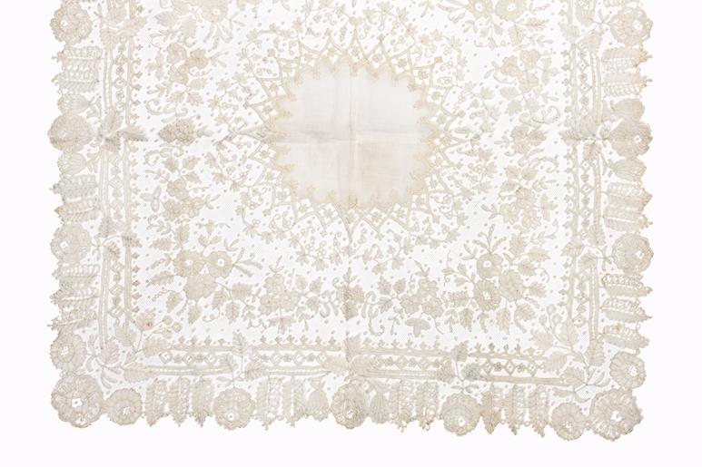 Keywords: Brudnäsduk - Hallwylska museet - 85924.tif BRUDDRÄKT jämte sexton lösa föremål Bestående av klänning slöja krona krans och bukett näsduk strumpor strumpeband skor linne snörliv kalsonger nattröja nattmössa morgonmössa och tofflor Klänning Liv och kjol samt fyra lösa bandlängder till rosett Av vit sidenmoiré moiré antique med handknuten garnering av gulvitt silke Hand- och maskinsydd Liv Högt bestående av två framstycken två sidostycken och ett ryggstycke alla sneddade Knäppning framtill med kulformiga vita snörmakeriknappar samt knapphål nedanför dessa hakar och hyskor av vit metall isydda med kaststygn under en kantslå av vitt siden Ärmar halvlånga nedre kanten rak Liv och ärmar fodrade med vitt glansigt bomullstyg s k kambrik I sömmarna stöd av valfiskben Kjol Bestående av åtta raka våder baktill ett fållat sprund samt i högra framsömmen en avlång ficka av tyg som livfodret sömmarna maskinsydda Mått Liv längd omkring 41 cm ; bröstvidd omkring 50 cm ; halsvidd omkring 37 cm ; midjevidd omkring 54 cm Ärmar längd omkring 54 cm ; vidd omkring 32 cm Holkar längd omkring 18 cm ; vidd omkring 26 cm Bårder bredd omkring 4 6 5 och 7 cm Tofs längd omkring 5 5 cm Frans längd omkring 3 5 och 8 cm Kjol längd fram omkring 1 16 m ; bak omkring 1 77 m ; vidd omkring 5 48 m Linning längd omkring 64 cm ; bredd omkring 3 cm <br/><br/>Bandlängder <br/>Av vit sidenrips med satinkanter de två korta till öglor de två långa till ändar de senare på vardera ytterändan med garnering som på livet <br/><br/>Mått <br/>Längd 0 41 och 1 36 m ; bredd 18 cm<br/><br/>Anm <br/>Rosetten troligen från en senare modellförändring <br/><br/>Slöja <br/>Av vit silkestyll Rektangulär i två olika stora stycken <br/><br/>Mått <br/>Stora stycket längd omkring 2 32 m ; bredd omkring 1 65 m <br/>Lilla stycket längd omkring 1 68 m ; bredd omkring 1 56 m<br/><br/>Krona <br/>Rund Stommen bestående av åtta radiella byglar av mörk karkas nedtill fästa vid en horisontell liggande ring byglarnas övre ändar sammanlöpande upptill i mitten till en nedåtvänd kort spets samt virade med tätt sittande myrtenkvistar <br/><br/>Krans <br/>Med stomme som kronan samt omvirad med myrtenkvistar <br/><br/>Bukett <br/>Av myrten med rester av vita liljor <br/>Dessutom fragment av en liten bukett bestående av en ros samt gullborste Linosyris vulgaris eller Aster linosyris; användes på 1800-talet och ännu i början av 1900- talet som grönt i buketter o d <br/><br/>Näsduk <br/>Av vit linnebatist med bred vit spets application de Bruxelles <br/>Kvadratisk handsydd <br/>Spetsen knypplad samt sydd på maskinvävd tyll <br/>Spetsen fastsydd med efterstygn av vit tvåtrådig linnetråd vid ett mittstycke av vit linnebatist <br/><br/>Mått <br/>Sidlängd omkring 43 cm <br/><br/>Strumpor ett par <br/>Av vitt silke vävda <br/>På vardera smalbenets utsida en tät rand upptill med axliknande avslutning samt nedtill tvådelad med en lång rand på foten och en kortare på hälen <br/>Upptill en bred fåll på utsidan med två par parallella smala ljusröda ränder <br/><br/>Mått <br/>Längd omkring 79 cm ; vidd omkring 22 5 cm <br/><br/>Strumpeband ett par <br/>Handsydda Av ljust rödgredelint sidentaftband varpå pålagt ett mittparti av vitt sidentaftband med stadkanterna omvikta och fastsydda med fållstygn av ljust rödgredelint silke <br/>Bandens ändar trubbvinkligt urklippta <br/><br/>Mått <br/>Längd omkring 1 m ; mittparti längd 25 cm <br/>Band bredd omkring 2 5 cm <br/><br/>Skor sedermera s k pumps ett par <br/>Av vit sidenatlas <br/>Hand- och vändsydda <br/>På vardera sidan på mitten två snett tvärgående efterstygnssömmar s k sidosömmar av vitt silke <br/>Knytband av vita smala tvåskaftade sidentaftband <br/>Bakstycket fodrat med vitt getskinn framstycket med vitt tvåskaftat linnetyg <br/>Sula av tunt ljusbrunt läder med tvärskuren tå Fodersula av vitt getskinn <br/>Klack av trä halvhög svagt insvängd klädd med vit sidenatlas samt med ytterlapp av ljusbrunt läder fäst med sex stift av mässing <br/><br/>Mått <br/>Längd omkring 24 cm ; bredd omkring 6 2 cm<br/>Klack höjd omkring 3 cm <br/>Knytband längd omkring 52 cm ; bredd 0 8 cm <br/><br/>Linne <br/>Av vitt tvåskaftat linnetyg samt med broderier <br/>Hand- och maskinsytt <br/>Fram- och bakstycke sneddade samt hopsydda med fällsömmar <br/>Ärmhålen starkt sneddade uppåt ärmarna korta med kilar <br/>Halsurringningen svagt rundad samt tätt rynkad <br/>Alla sömmar sydda med fin vit bomullstråd <br/><br/>Mått <br/>Längd omkring 1 07 m ; vidd nedtill 1 8 m <br/>Ärmar längd omkring 7 8 cm ; vidd omkring 36 cm <br/>Halslinning längd omkring 93 cm ; bredd omkring 0 8 cm <br/><br/>Snörliv <br/>Av vitt fyrskaftat bomullstyg och vitt tvåskaftat linnetyg <br/>Handsytt <br/>Två symmetriska sneddade stycken hopsydda framtill i mitten och bildande en lång spets Nedtill på vardera sidan om denna fyra kilar en tresidig och tre fyrsidiga upptill två starkt sneddade tresidiga kilar Mellan kilarna ett stöd av valfiskben utanför bortre kilen sex dylika stöd <br/>Sömmarna sydda dels med vitt silke dels med vit bomullstråd <br/><br/>Mått <br/>Höjd fram omkring 35 5 cm ; bak omkring 35 cm <br/>Midjevidd omkring 46 cm <br/><br/>Kalsonger s k öppna ett par <br/>Av vitt smalrandigt fyrskaftat bomullstyg samt med broderi <br/>Handsydda och handbroderade <br/>Bestående av två fram- och baktill sneddade stycken på framsidan hopsydda ett stycke upptill med fällsöm <br/>Alla sömmar sydda med vit fin bomullstråd <br/>Mått <br/>Längd omkring 84 cm ; linning längd omkring 94 cm <br/>Ben vidd nedtill omkring 56 cm ; band längd omkring 83 cm <br/><br/>Underkjol <br/>Av vitt tvåskaftat bomullstyg samt med broderi <br/>Hand- och maskinsydd <br/>Bestående av fem raka våder upptill tätt rynkad runtomkring samt fastsydd med fållstygn vid en sneddad linning med dragsko <br/>Alla sömm