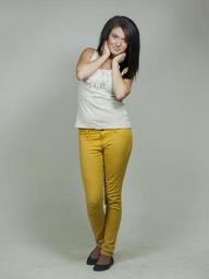 Keywords: brunette full body whole person posing girl woman white background grey yellow pants in pants