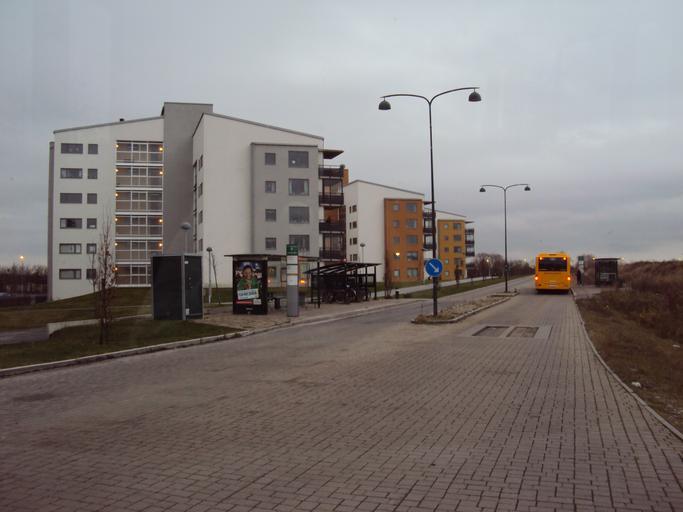 Keywords: Brunnshög C.JPG sv Några av bostadshusen på Brunnshög sett från busshållplatsen own Spull 091210 Buildings in Lund Bus stops in Sweden