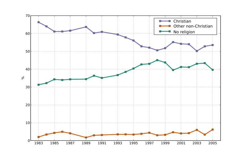 | Keywords: Bsa-religion-question-1983-2005.svg en wikipedia 2009 April 11 en Time series of responses to British Social Attitudes question Do you regard yourself as belonging to any particular religion IF YES Which IF 'Christian' PROBE FOR DENOMINATION Results for all non-Christian religions have been combined Data Year 1983 1984 1985 1986 1987 1989 1990 1991 1993 1994 1995 1996 1997 1998 1999 2000 2001 2002 2003 2004 2005 Christian 66 31 63 97 61 08 61 11 61 57 63 68 60 22 60 92 59 42 57 8 56 05 52 8 52 05 50 54 51 77 55 18 54 18 53 99 50 14 52 79 53 55 Other non-Christian 1 99 3 41 4 32 4 93 4 08 1 7 2 93 3 13 3 48 3 48 3 39 3 79 4 39 2 98 3 23 4 66 4 00 4 17 5 99 3 33 6 19 No religion 31 28 32 2 34 29 33 95 34 32 34 41 36 34 35 08 36 68 38 49 40 38 42 66 43 02 45 06 43 75 39 5 41 22 41 11 43 04 43 4 39 63 Ref/NA 0 35 0 45 0 31 0 03 0 09 0 17 0 5 0 78 0 43 0 2 0 18 0 79 0 52 1 36 1 2 0 59 0 66 0 72 0 82 0 49 0 6 Data from the British Social Attitudes Survey http //www britsocat com/BodySecure aspx control BritsocatMarginals var RELIGION SurveyID 221 Created with Matplotlib Made using matplotlib with this python program <source lang python > /usr/bin/env python from pylab import rc 'font' family 'sans-serif' rc 'figure' figsize 12 8 t 1983 1984 1985 1986 1987 1989 1990 1991 1993 1994 1995 1996 1997 1998 1999 2000 2001 2002 2003 2004 2005 seriesChristian 66 31 63 97 61 08 61 11 61 57 63 68 60 22 60 92 59 42 57 8 56 05 52 8 52 05 50 54 51 77 55 18 54 18 53 99 50 14 52 79 53 55 seriesOther 1 99 3 41 4 32 4 93 4 08 1 7 2 93 3 13 3 48 3 48 3 39 3 79 4 39 2 98 3 23 4 66 4 00 4 17 5 99 3 33 6 19 seriesNone 31 28 32 2 34 29 33 95 34 32 34 41 36 34 35 08 36 68 38 49 40 38 42 66 43 02 45 06 43 75 39 5 41 22 41 11 43 04 43 4 39 63 seriesNA 0 35 0 45 0 31 0 03 0 09 0 17 0 5 0 78 0 43 0 2 0 18 0 79 0 52 1 36 1 2 0 59 0 66 0 72 0 82 0 49 0 6 red-green colourblind friendly plot t seriesChristian 's-' lw 3 color ' 7570b3' plot t seriesOther 's-' lw 3 color ' d95f02' plot t seriesNone 's-' lw 3 color ' 1b9377' ylabel ' ' axis 1982 2006 0 70 xticks arange 1983 2006 2 legend 'Christian' 'Other non-Christian' 'No religion' 'upper right' grid True savefig 'bsa-religion-question-1983-2005 svg' </source> Transferred from http //en wikipedia org en wikipedia; transferred to Commons by User Drilnoth using http //tools wikimedia de/~magnus/commonshelper php CommonsHelper 2008-02-24 Original uploader was Duncan Keith at http //en wikipedia org en wikipedia Released into the public domain by the author en wikipedia Duncan Keith Original upload log page en wikipedia Bsa-religion-question-1983-2005 svg 2008-02-24 08 37 Duncan Keith 862×551× 35718 bytes <nowiki>Corrected 'Other non-Christian' data Redone in matplotlib to fix legend rendering issue</nowiki> 2007-10-19 16 05 Duncan Keith 1300×780× 82685 bytes <nowiki>Legend fixed </nowiki> 2007-10-19 15 52 Duncan Keith 1300×780× 82892 bytes <nowiki>Time series of responses to British Social Attitudes question Do you regard yourself as belonging to any particular religion IF YES Which IF 'Christian' PROBE FOR DENOMINATION </nowiki> Religion in the United Kingdom SVG charts in English Images with Python source code |