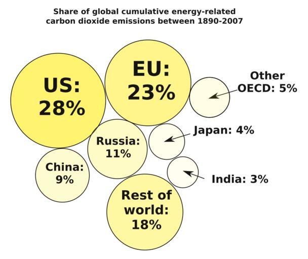 | Keywords: Bubble diagram showing the share of global cumulative energy-related carbon dioxide emissions for major emitters between 1890-2007.svg carbon dioxide emissions between 1890-2007 Major emitters are shown percentage share in brackets the United States 28 the European Union 23 Russia 11 China 9 other OECD countries 5 Japan 4 India 3 and the rest of the world 18 Data are from IEA 2009 For more information see greenhouse gas The area and colouring of the circles is proportional to the share of emissions The radius of the circles equals the square root of area / References IEA 2009 http //www worldenergyoutlook org/media/weowebsite/2009/WEO2009 pdf World Energy Outlook 2009 p 180 p 182 of PDF http //www iea org/ International Energy Agency IEA Paris France ISBN 978-92-64-06130-9 own Enescot 2012-11-13 Data Data from the IEA 2009 are given below as comma-separated values CSV The data were exported from OpenOffice 3 4 1 Calc using the following options enclosed in braces Character set Western Europe Windows-1252/WinLatin ; Field delimiter ; text delimiter <pre> Region/country a area r radius d diameter Rest of world 18 2 3936536824 4 7873073648 India 3 0 9772050238 1 9544100476 Japan 4 1 1283791671 2 2567583342 Other OECD 5 1 261566261 2 523132522 China 9 1 6925687506 3 3851375013 Russia 11 1 8712051593 3 7424103185 European Union 23 2 7057581899 5 4115163798 United States 28 2 9854106607 5 9708213214 </pre> Global warming graphs Atmospheric carbon dioxide Cc-zero |