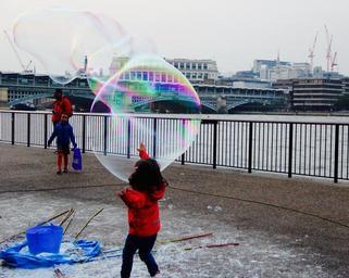 Keywords: bubbles street artist children joy artistic riverside kids fun playing city