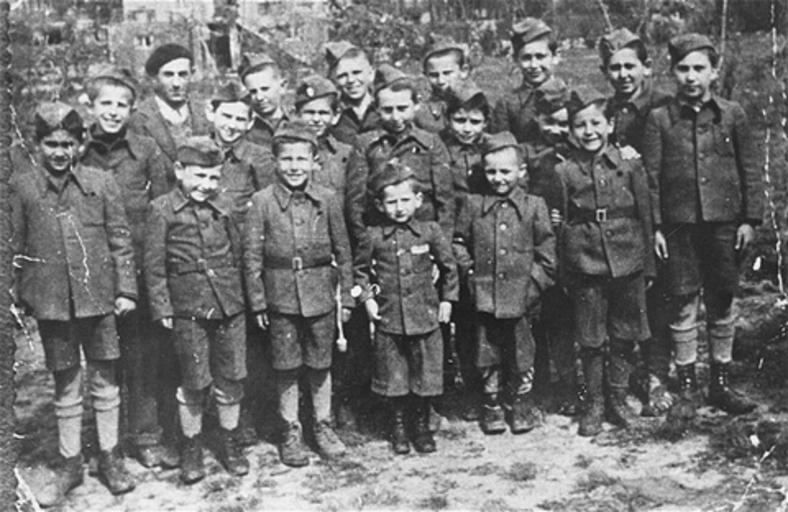 | Keywords: Buchenwald Children 19753.jpg Group portrait of child survivors of the Buchenwald concentration camp The boys are dressed in outfits made from German uniforms due to a clothing shortage Among those pictured are first row left to right Lolek Blum David Perlmutter Birenbaum Joseph Schleifstein unidentified and Israel Meir Lau middle row far right Middle row Nathan Szwarc Jack Neeman Berek Silber Jacques Finkel unidentified Marek Milstein and Salek Finkelsztein Back row Elek Grinbaum or Grinberg Chaim Finkelstajn or Charles Finkel Romek Wekselman or Wajsman and Abram Czapnik Josef Janek Szlajfaztajn later Joseph Schleifstein is the son of Izrael and Esther Schleifstein He was born on March 7 1941 in Sandomierz Poland during the German occupation The family remained in Sandomierz through its existence as a ghetto from June 1942 through January 1943 After the liquidation of the ghetto the family was moved to Czestochowa where Israel and Esther were presumably put to work in one of the HASAG factory camps During this period Joseph was placed in hiding in the area Israel was sent to work for the Letzium Work Camp in the Radom District working for a firm called Ralnik from October 1942 till September 1943 He worked in Makashin near Sandomierz from September till December 1943; in a HASAG ammunition factory in Kielc from December 1943 to approximately November 1944; and for a short time in Czestochowa In January 1945 when the HASAG camps were closed and their operations transferred to Germany the Schleifsteins were deported to Germany Esther was sent to the Bergen-Belsen concentration camp Izrael and Josef were taken to Buchenwald and arrived on January 20 1945 Izrael successfully passed the selection process by concealing Josef in a large sack in which he carried his leather-working tools The child could not remain concealed for long in the camp but his life was spared in part because the Germans valued Israel's craftsmanship and in part because they took a liking to the child The SS guards came to treat Joseph as a camp mascot and even had him appear at roll calls wearing a child-sized striped uniform Despite this special treatment Joseph remembers being lined-up for execution at one point and his father intervening at the last moment to save him He also remembers being very sick during his imprisonment and living in a hospital for a time Soon after their liberation in Buchenwald Israel and Josef were taken to Switzerland for medical treatment Some months later they were reunited with Esther in Dachau where they lived until emigrating to the U S in 1947 The Buchenwald children were a group of approximately 1000 Jewish child survivors found by American troops when they liberated the Buchenwald concentration camp on April 11 1945 Most of the children were originally from Poland though others came from Hungary Slovenia and Ruthenia Unsure of what to do with the child survivors American army chaplains Rabbi Herschel Schacter and Rabbi Robert Marcus contacted the offices of the OSE Oeuvre de Secours aux Enfants Jewish children's relief organization in Geneva They arranged to send 427 of the children to France 280 to Switzerland and 250 to England Vivette Samuels reverses the figures for England and Switzerland in her monograph Sauver les Enfants On June 2 1945 OSE representatives arrived in Buchenwald and together with Rabbi Marcus escorted the transport of children to France Rabbi Schacter accompanied the second transport to Switzerland Because of the difficulty in finding clothing for the children the boys were clad in Hitler Youth uniforms This created a problem for when the train crossed into France it was greeted by an angry populace who assumed the train was carrying Nazi youth Thereafter the words KZ Buchenwald orphans were painted on the outside of the train to avoid confusion On June 6 1945 the French transport arrived at the Andelys station and the orphans were taken to a children's home in Ecouis Eure The home had been set up to accommodate young children but in fact only 30 of the boys were below the age of 13 This was only one of the many problems faced by the OSE personnel who were not prepared to handle a large group of demanding rebellious teenagers who were full of anger for what they had experienced At Ecouis the boys were given medical care counseling and schooling until more permanent accommodations could be found Most of the children remained only four to eight weeks at Ecouis before being moved elsewhere and the home was closed in August 1945 Among the first to leave were a group of 173 children who had family in Palestine They were given immigration certificates and departed from Marseilles in July aboard the British vessel the RMS Mataroa The remaining boys at Ecouis were soon transferred to other residences and homes Some of the older ones were sent to the Foyer d'Etudiants located on the rue Rollin in Paris where they boarded while attending vocational training courses or working at jobs in the city Others were sent to the Chateau de Boucicaut home in Fontenay-aux-Roses Hauts-de-Seine Many of the boys came from religiously observant homes Since the OSE could not obtain kosher food for everyone they divided the children into religious and non-religious groups Dr Charly Merzbach offered OSE the use of his estate the Chateau d'Ambloy Loir-et-Cher for the summer and between 90 and 100 boys chose to go there in order to receive kosher food and live in a religious environment In October 1945 the children and staff of Ambloy were relocated to the Chateau de Vaucelles in Taverny Val d'Oise About 50 of the non-religious boys were taken to the Villa Concordiale in Le Vesinet Yvelines near Paris that housed an equal number of French Jewish orphans In the summer they went to the Foyer de Champigny in Champigny-sur-Marne Val-de-Marne In all the homes attended by the Buchenwald children vocational training as well as regular classroom instruction was offered At the same time 