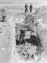 | Keywords: Buchenwald Zeitz Mass Grave 80916.jpg Under the direction of American soldiers German civilians exhume the bodies of prisoners from a mass grave 14 km east of Zeitz On June 18 1945 the 7th U S Army 69th Infantry Division was notified about a mass grave near Zeitz The grave was discovered by a Dutch soldier who had been a prisoner for three years in the nearby labor camp of Troeglitz a sub-camp of Buchenwald The 400 victims exhumed from the grave were also prisoners of Troeglitz which provided labor for Brabag Braunkohle-Benzin AG All the victims were male and without identification except for a few with numbers on their tattered and partly decayed clothing Civilians from the area claimed that the bodies were buried just before the arrival of U S Army troops Photographed by Ernest J Braun Zeitz Prussian Saxony;Saxony-Anhalt Germany June 18 1945 http //www ushmm org/ United States Holocaust Memorial Museum courtesy of National Archives and Records Administration College Park PD-USGov Corpses in Buchenwald concentration camp Images from the United States Holocaust Memorial Museum Forced labor of Germans after World War II Allied confrontation of Germans with Holocaust 69th Infantry Division US Army |