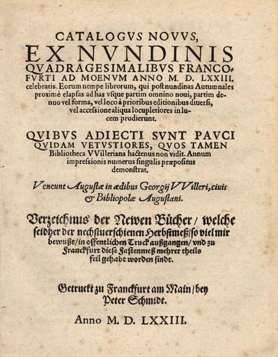 | Keywords: Buchkatalog Frankfurter Fastenmesse 1573.jpg Georg Willer der Ältere Catalogus novus ex nundinis celebratis Verzeichnus der Newn Bücher welche seidher der nechstuerschienen Herbstmeß so viel mir bewußt in offentlichen Truck außgangen und zu Franckfurt diese Fastenmeß mehrer theils feil gehabt worden sindt Peter Schmidt Frankfurt am Main 1573 14 Blätter geheftet 19 5 x 15 cm PD-Art Source http //www bassenge com/ Frankfurt Book Fair 1573 books Images from Galerie Bassenge Artworks missing infobox template |