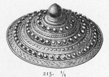 Keywords: Buckler 01.jpg Schildbuckel für einen Buckler skandinavisch Bronze mit vergoldetem Silber Oluf Rygh Norske Oldsager 1885 2011-06-23 Oluf Rygh PD-old Fingalo Is Shield bosses