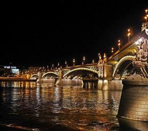 Keywords: budapest at night margaret bridge illuminated street lanterns danube wave transit y bridge pillar steel structure water reflection river hungary current places of interest night lighting water ship passage impressive capital flow