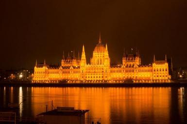 Keywords: budapest castle water mirroring abendstimmung illuminated mood gold night photograph