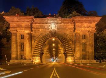 Keywords: budapest hungary road highway gate tunnel architecture night evening lights lighting outside beautiful city cities urban