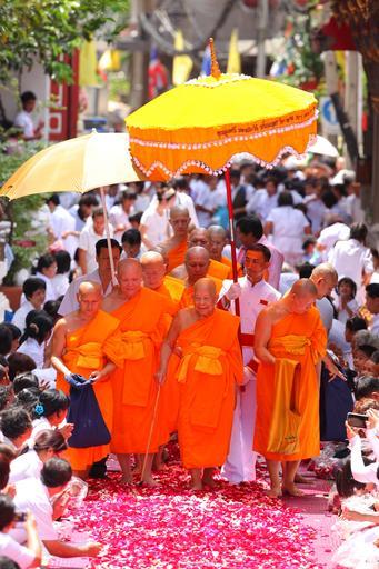 Keywords: buddhists supreme patriarch patriarch priests monk orange robes walk rose petals thailand asia thai religion belief