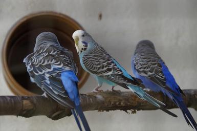 Keywords: budgerigars parakeets pets animal world small parrot friendship animals birds sit together three blue