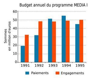 | Keywords: Budget MEDIA I 1991-1995.svg MEDIA I own Budget adoptĂ© trouvĂ© sur http //eur-lex europa eu/fr/index htm Eurlex budget 1992 -> p 710/1575 budget 1993 “> p 824/1701 http //eur-lex europa eu/Result do code 31997B0105 Submit Rechercher RechType RECH_celex _submit Rechercher budget 1997 Consultable en tiff pp 791 799 Treehill Cc-zero European Union Budget charts |