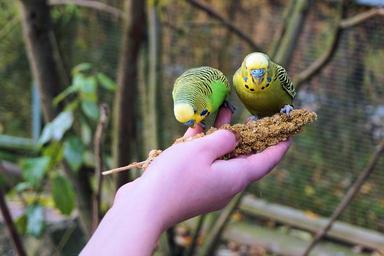 Keywords: budgie budgerigar on the hand feeding trustful trust animal bird feed cute small bird feather colorful color plumage sababurg castle zoo zoo sababurg