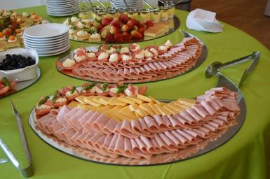 Keywords: buffet food restaurant catering meat cheese service serving table table cloth delicious tasty gourmet dining eat cuisine