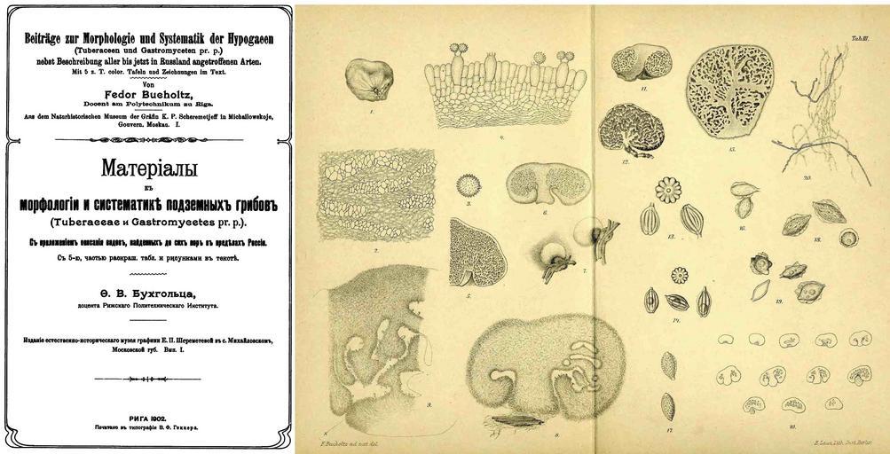 | Keywords: Buholz1902.jpg ru Ф В Бухгольц ате иалы к мо фологии и систематике подземных г ибов Титульный лист и таблица исунков de F Bucholtz Beiträge zur Morphologie und Systematik der Hypogaeen 1902 scanned book F Bucholtz A Bondartsev PD-RusEmpire Uploaded with UploadWizard Botany book covers single pages etc |