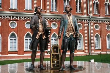 Keywords: building architecture red walls ornate statues monument two figures bronze metals historic
