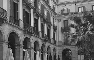 Keywords: building balconies balcony windows palm trees black and white architecture