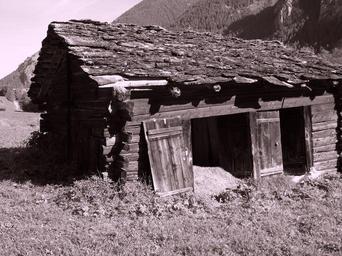 Keywords: building barn shed rundown farm mountains outside black and white wooden grass