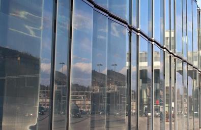 Keywords: building facade glass mirroring structure architecture modern detail close rorschach switzerland