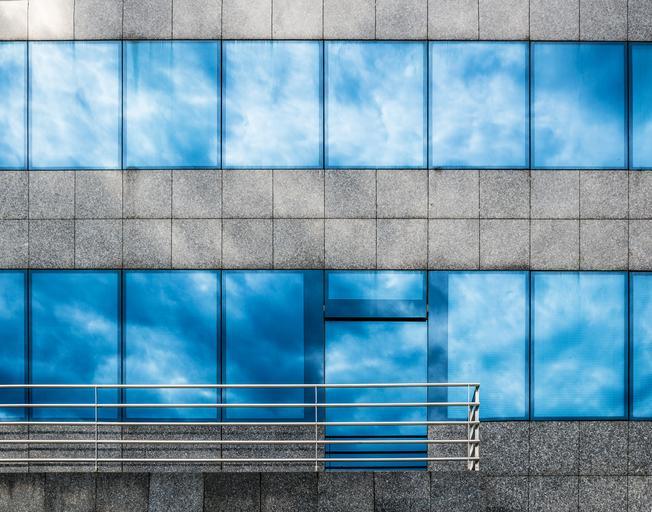 Keywords: building office steel business window glass reflection urban architecture blue gray grey corporate wall facade