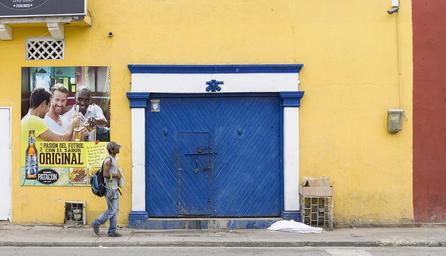 Keywords: building old colonial doors architecture grunge painted urban city pedestrian colombia cartagena historic caribbean street facade spanish ancient town latin man walking beer