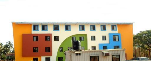 Keywords: building orange house home architecture residential apartment urban design blue green white wall