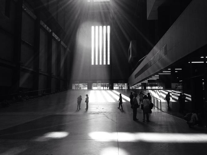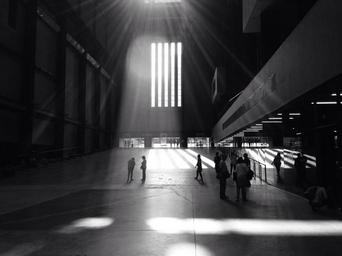 Keywords: building people waiting shadows architecture tate london uk wide modern urban skylight sunlight walking black and white